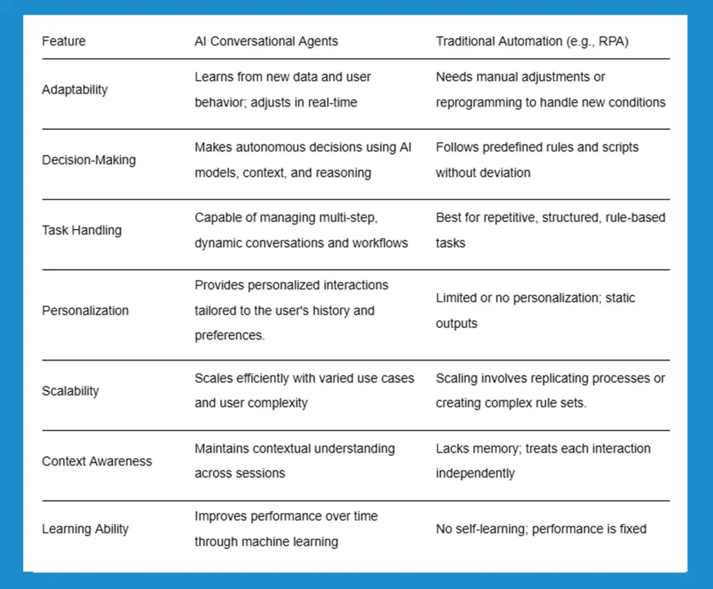 Contrary to more traditional approaches to chatbots that use pre-written responses (i.e., continue to respond in scripted ways), or robotic process automation (RPA), whose behavior is governed by strict rules, AI agents apply machine learning (ML), natural language processing (NLP), and large language models (LLM) to dynamically learn new information.