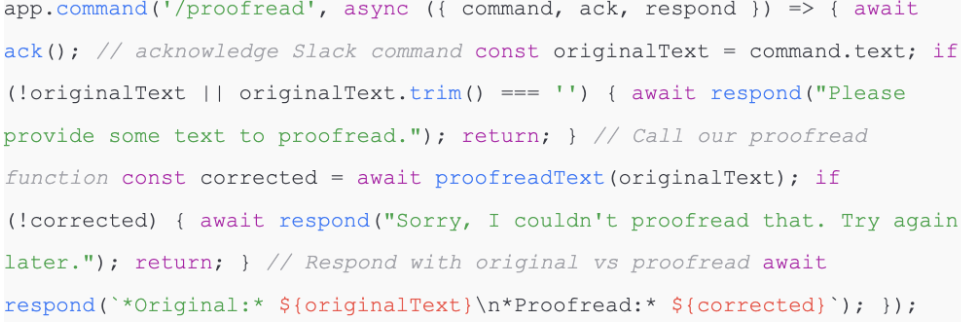 - It uses respond () to send a message back in the Slack channel (or DM) showing the original and the proofread text.
