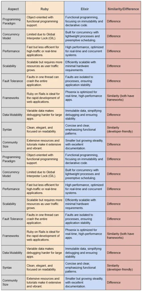 Both Ruby and Elixir are powerful programming languages but, in 2025, they have different applications. Ruby (with Ruby on Rails) is the ideal choice in the context of rapid development, an enormous ecosystem of gems, SaaS or marketplace applications. Elixir (and Phoenix Framework) is good at real-time and concurrent systems, as well as at fault-tolerant ones like chat applications, financial technology, and data-intensive ones. It is up to you whether you appreciate developer productivity and ecosystem (Ruby) or performance and scalability (Elixir).